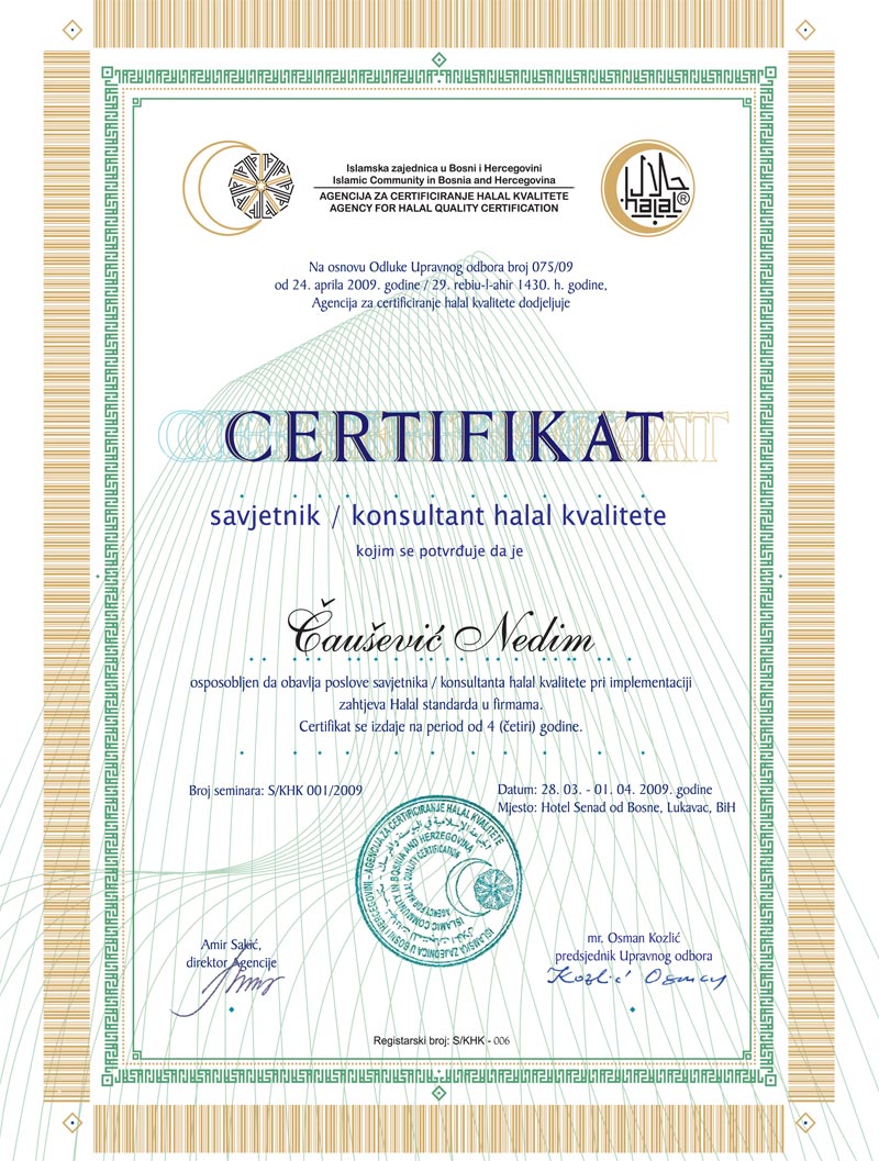 Sve firme koje zadovolje zahtjeve Halal standarda dobijaju Halal certifikat koji je svojevrsna ulaznica na ovo atraktivno tržište. Proces certificiranja i izdavanja Halal certifikata u saradnji s Islamskim zajednicama u drzavama Jugoistočne Evrope vrši Agencija za certificiranje halal kvalitete. Proces implementacije zahtjeva Halal standarda i izrada sistemske dokumentacije u zainteresiranim firmama je veoma ozbiljan i zahtjevan posao. Da bi se ovaj proces u zainteresiranim firmama olakšao i ubrzao neophodan je angažman ovlaštenog savjetnika/konsultanata halal kvalitete.